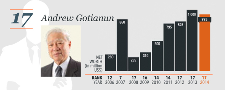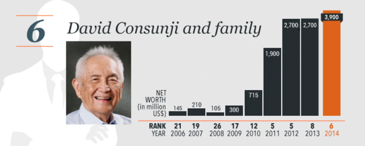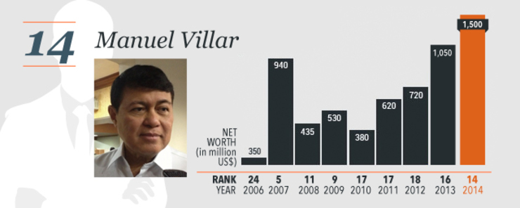 Forbes said this year’s list reflected two driving forces in the Philippine economy: construction and consumption. Riding on these were former senator Manuel Villar of mall developer Starmalls and DMCI Holdings’ David Consunji. Villar’s net worth reached $1.46 billion, making him the 14th richest man in the country, while Consunji grabbed the 6th spot, with a net worth of $3.9 billion.