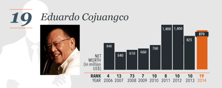 Cojuangco, 79, became a billionaire as his widely San Miguel Corporation grew. His fortune fell below 10-digit mark after selling stake in the diversified conglomerate. He, however, still sits as chairman.