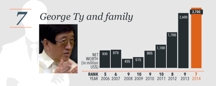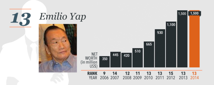 With a net worth of US$12.7 billion, the 89-year-old Sy held the top spot for the 7th straight year. His worth increased by $700 million from last year, thanks largely to the rising share prices of his mall and banking businesses.
