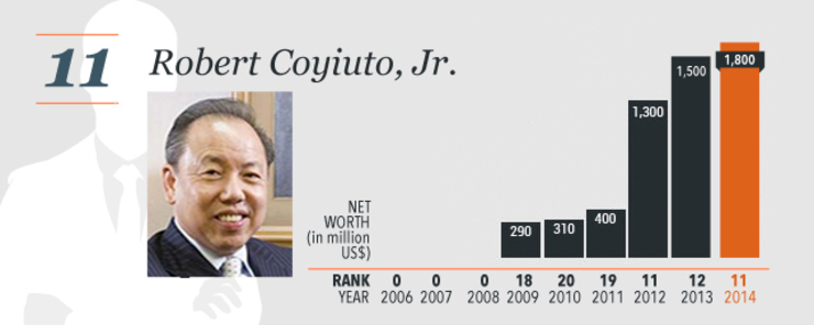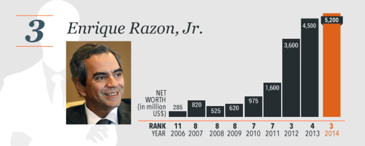 Port and casino tycoon Enrique Razon Jr., 54, climbed one place, making him the third richest, with a net worth of $5.2 billion.