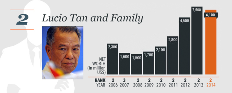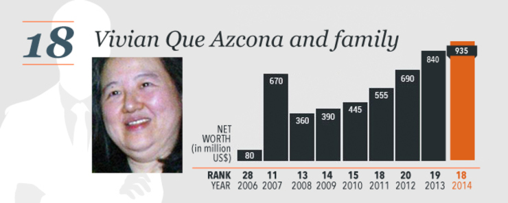 The collective wealth of the 50 richest people in the Philippines reached $74 billion in 2014, up 12% from $65.8 billion in 2013.