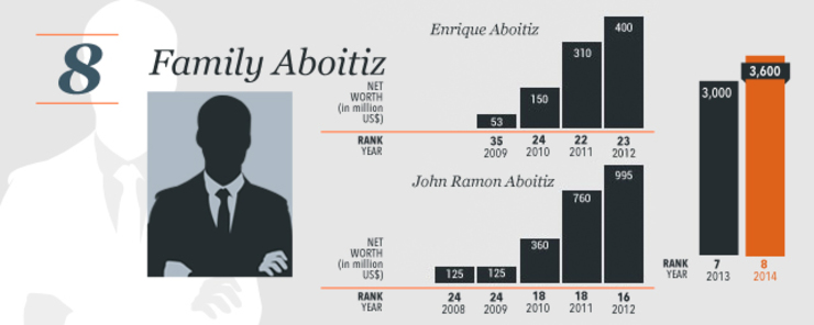 The family controls Aboitiz Equity Ventures, whose core businesses include power (Aboitiz Power), banking (Union Bank), and food (Pilmico Foods). The family’s fortune was earlier split and listed separately under patriarch Enrique and his nephew Jon Ramon.