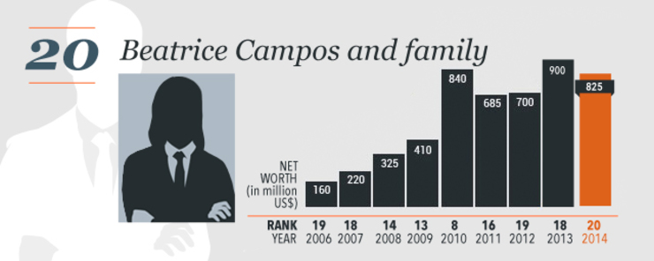 She is the widow of Jose Campos of giant local drugmaker Unilab. Her family holds a stake in global food and beverage manufacturer Del Monte Pacific.